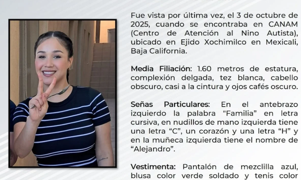 De acuerdo a los datos generales, Joseline fue vista por última vez cuando llega al Centro de Atención al Niño Autista (Canam), ubicado en el Ejido Xochimilco de la capital bajacaliforniana.