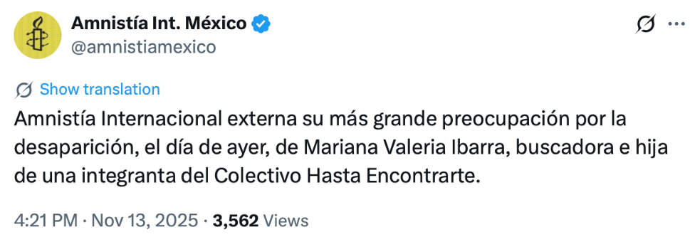 La organización Amnistía Internacional (AI) se ha manifestado con su “más grande preocupación” debido a la desaparición de Mariana Valeria Ibarra Ojeda, buscadora e hija de una integrante del colectivo ‘Hasta Encontrarte’, en el estado de Guanajuato, centro de México.