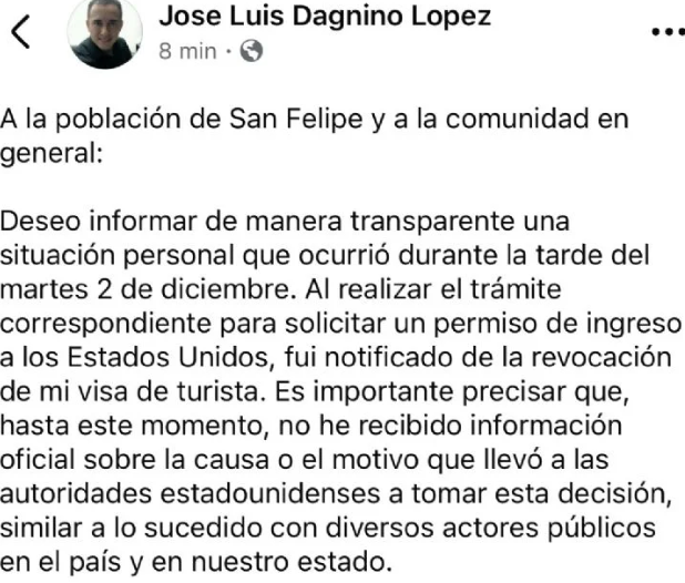 “El trámite correspondiente para solicitar un permiso de ingreso a los Estados Unidos, fui notificado de la revocación de mi visa de turista. Es importante precisar que, hasta este momento, no he recibido información oficial sobre la causa o el motivo que llevó a las autoridades estadunidenses a tomar esta decisión, similar a lo sucedido con diversos actores públicos en el país y en nuestro estado”, según escribió.