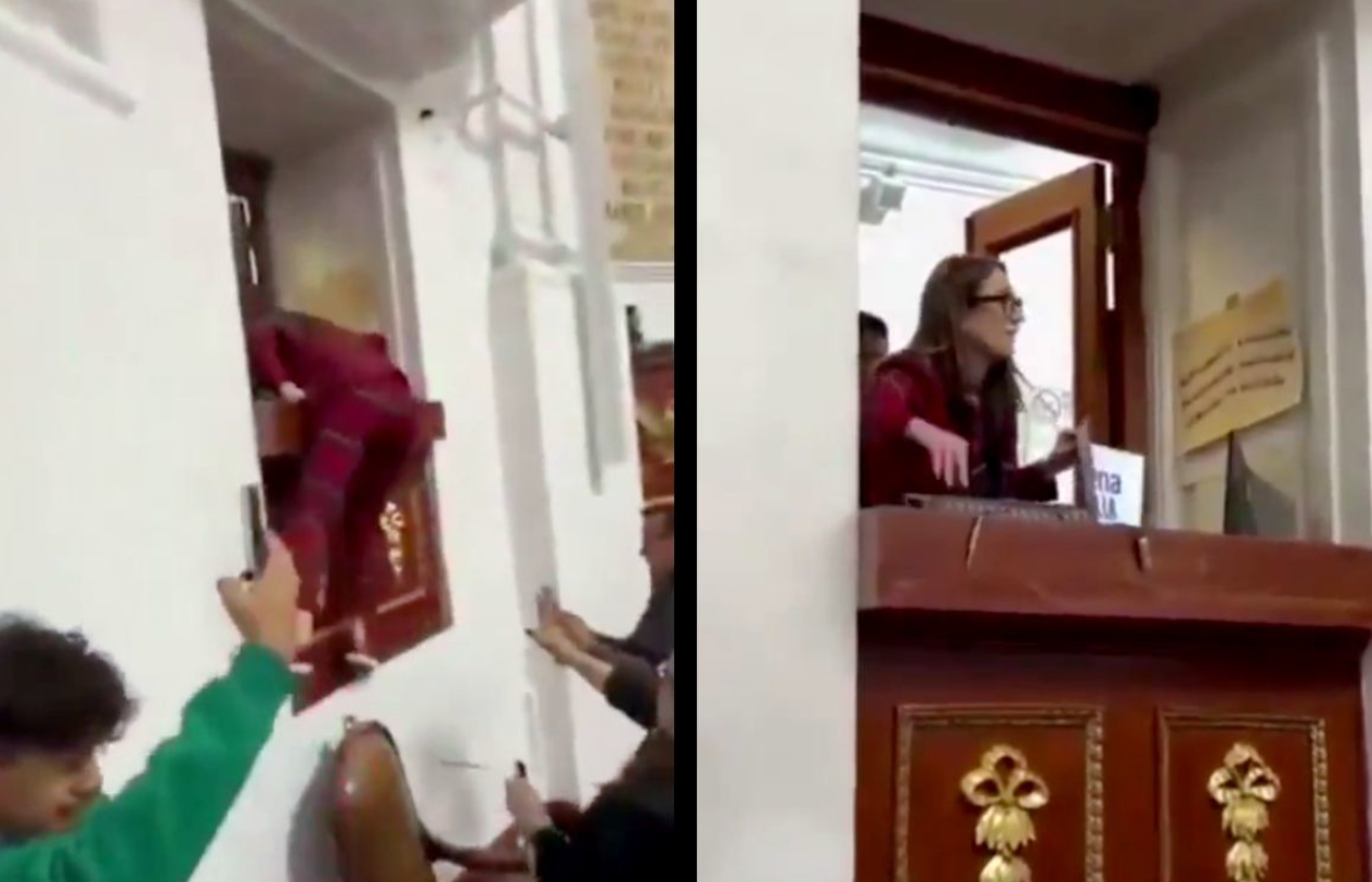 A través de redes sociales, se compartieron imágenes de Tania Larios parada sobre una silla de la sala de sesiones y brincando a un balcón donde se encuentra la cabina de audio que controla los micrófonos de los legisladores capitalinos.