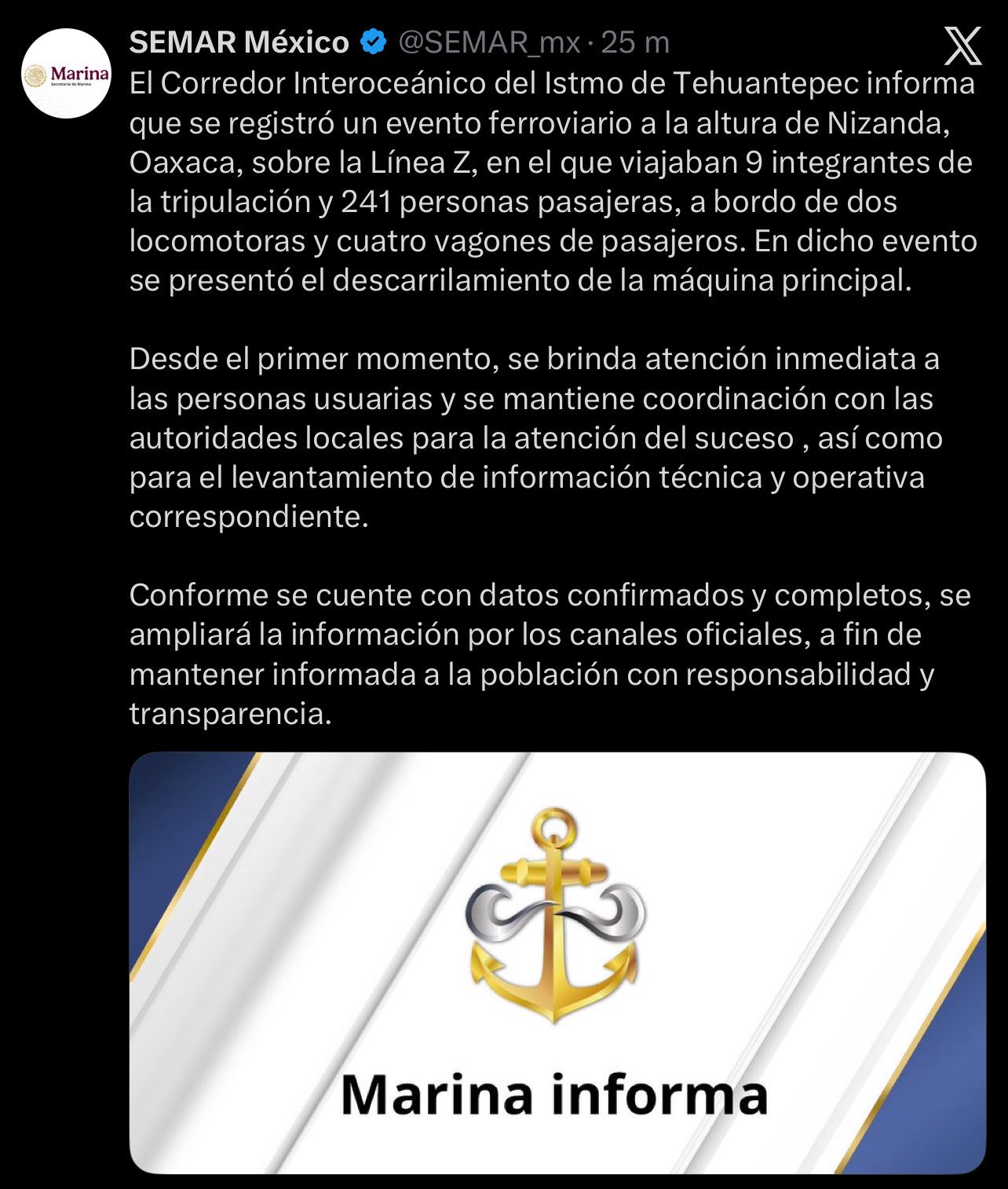 CIUDAD DE MÉXICO  – La Secretaría de Marina ha informado de al menos 13 personas muertas a causa del descarrilamiento del tren del Corredor Interoceánico del Itsmo de Tehuantepec acontecido en horas de la mañana de este domingo.