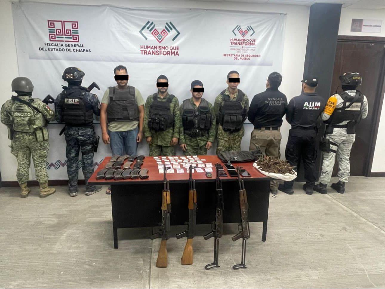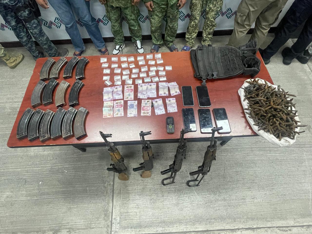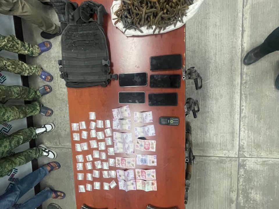 Las personas capturadas han sido identificadas como Mario “N”, Jhovany “N”, Carlos “N”, y César “N”. Además, se aseguraron cuatro armas largas con sus respectivos cargadores abastecidos, 10 cargadores adicionales para armas de fuego, 36 bolsitas de nylon con sustancias características propias de la cocaina, dinero en efectivo, cinco chalecos tácticos, un costal con objetos conocidos como ponchallantas, seis teléfonos celulares y el vehículo en el que se desplazaban los imputados.