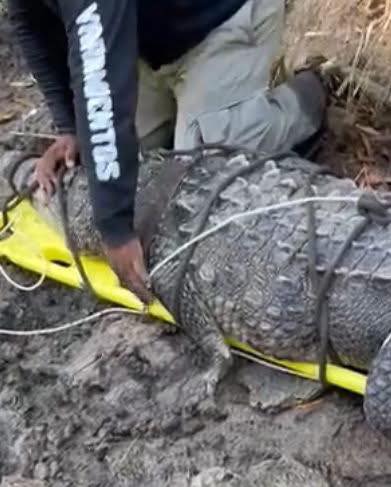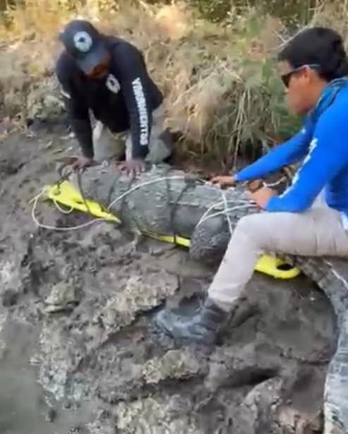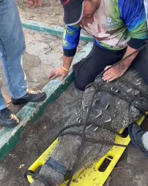 Un cocodrilo de al menos 150 kilogramos de peso y 3.20 metros de longitud ha sido rescatado en el ejido Cabeza de Toro, después del reporte un ciudadano que llama la atención sobre la presencia del enorme ejemplar en una zona habitada.