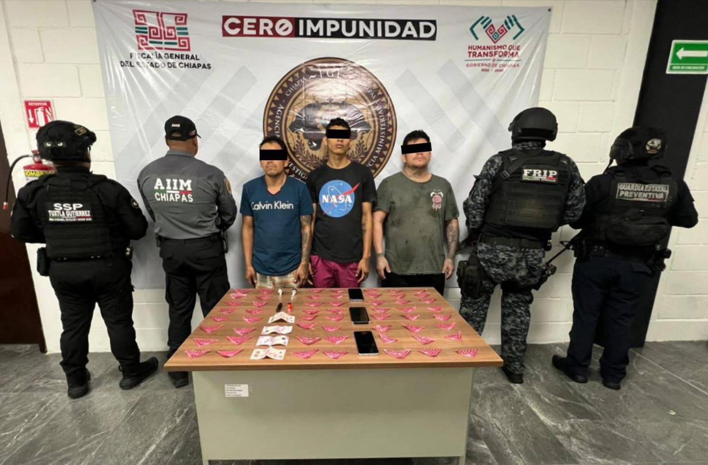 La Secretaría de Seguridad del Pueblo (SSP) a través de la Fuerza de Reacción Inmediata Pakal (FRIP) y Guardia Estatal Preventiva en coordinación con la Agencia de Investigación e Inteligencia Ministerial (AIIM) de la Fiscalía General del Estado (FGE) y Policía Municipal, ejecutaron la captura de tres presuntos responsables del delito contra la salud, en el municipio de Tuxtla Gutiérrez.