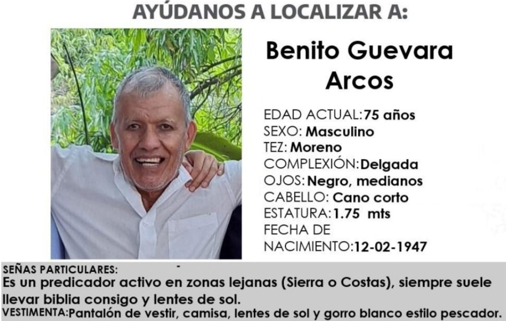 Se trata de Benito Guevara Arcos, originario de la comunidad El Ocotito. Fue visto por última vez el martes 31 de marzo en el poblado de San Vicente, cuando acudió a predicar, según reportó la Comisión Estatal de Búsqueda de Personas (CEBP).